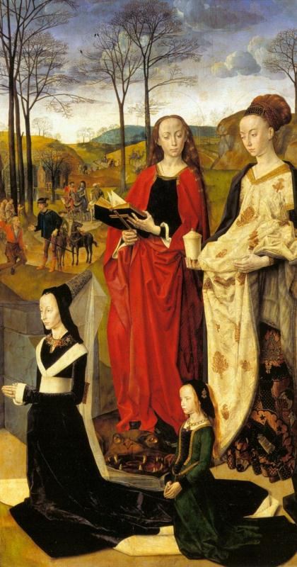 《波蒂奈伊祭坛画》为三联组画,中央为《耶稣降生》,左翼《圣徒与供养人》,此画为《波蒂奈伊祭坛画》右翼的《圣女与供养人》。画中前面描绘两位跪着迎接耶稣降生的天使,这两个天使的身体比例格外小一些,脸上也 缺乏表情,而站着的两位圣女形象却十分生动。浅黄色的衣服与圣女的肤色相呼应。整幅画面刻画细致而准确,具 有古典雕刻般的稳定性。