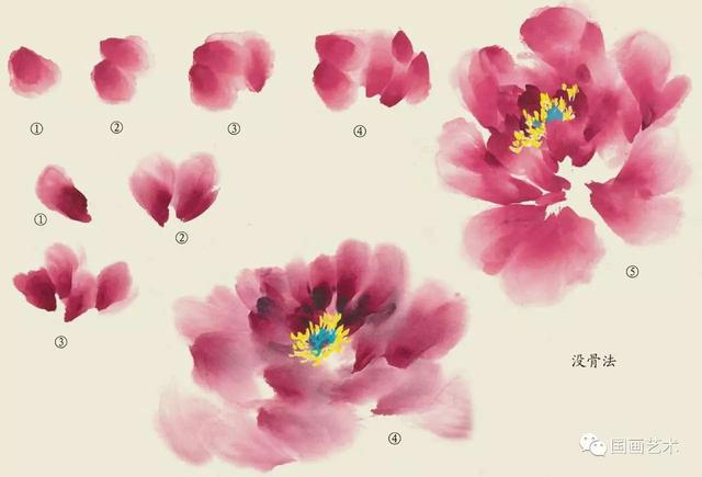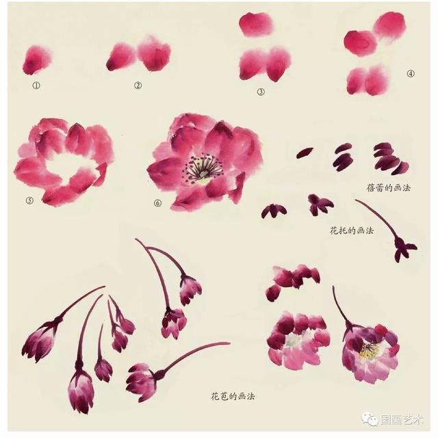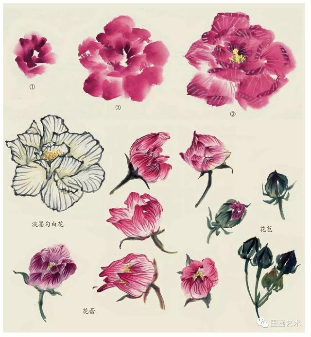 花有两种画法:一是勾线填色法,用淡墨色勾出一小花朵,向四周渐淡勾画成大花形。以汁绿晕染每小朵之间的暗部分出层次。用白粉点染花瓣。二是没骨(点厾)法,笔调白粉加曙红(或花青)笔尖蘸曙红(或花青)逐一点出花瓣成朵,用胭脂(或花青)提点花朵中的暗部以增加层次感。