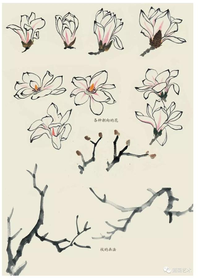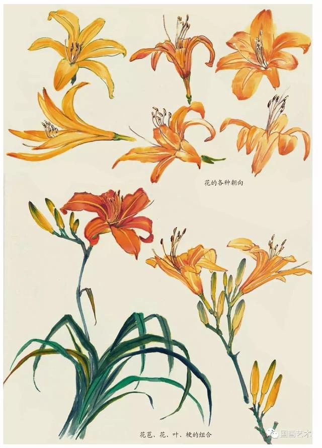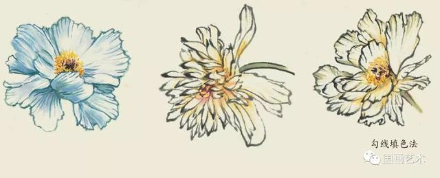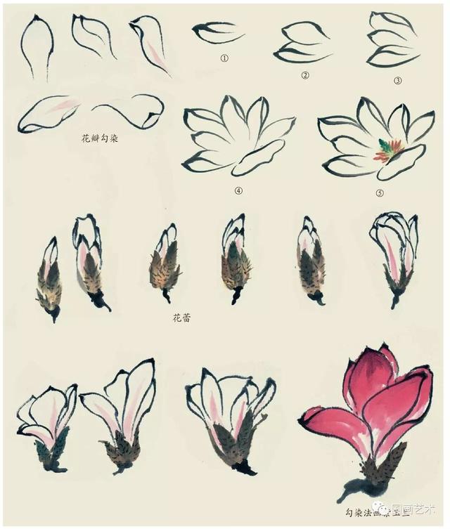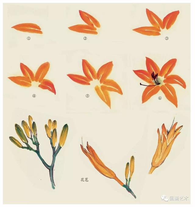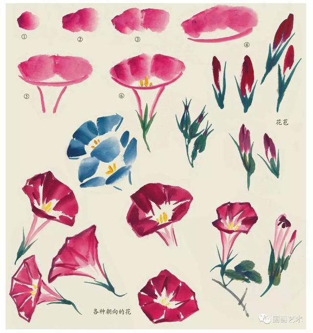 花的画法:笔蘸浓墨勾杯状花冠,用中、淡墨色勾内层的三瓣,再勾花的外层三瓣。接着画花筒和花柄。用白粉罩染花瓣。花冠用藤黄调朱磦染,干后浓墨(或赭石)点蕊。花筒和花柄用汁绿染,待未干时可用三绿色局部提点。