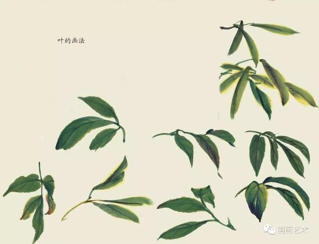叶的画法:笔调汁绿色,笔尖蘸墨(或花青)按一组五、六片画出大小不同的叶子。嫩叶用汁绿蘸胭脂(或朱磦)色画出。待半干时勾叶筋。
