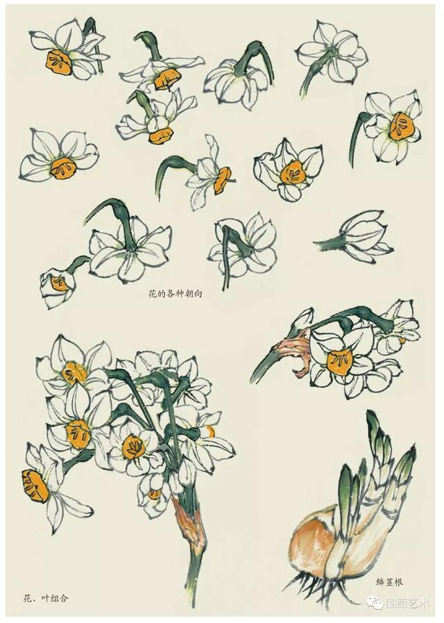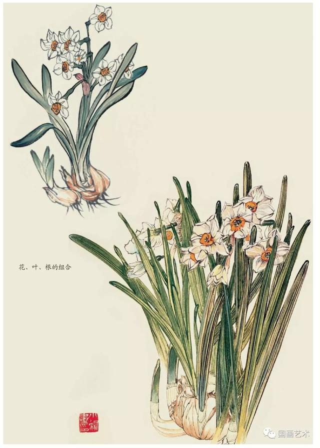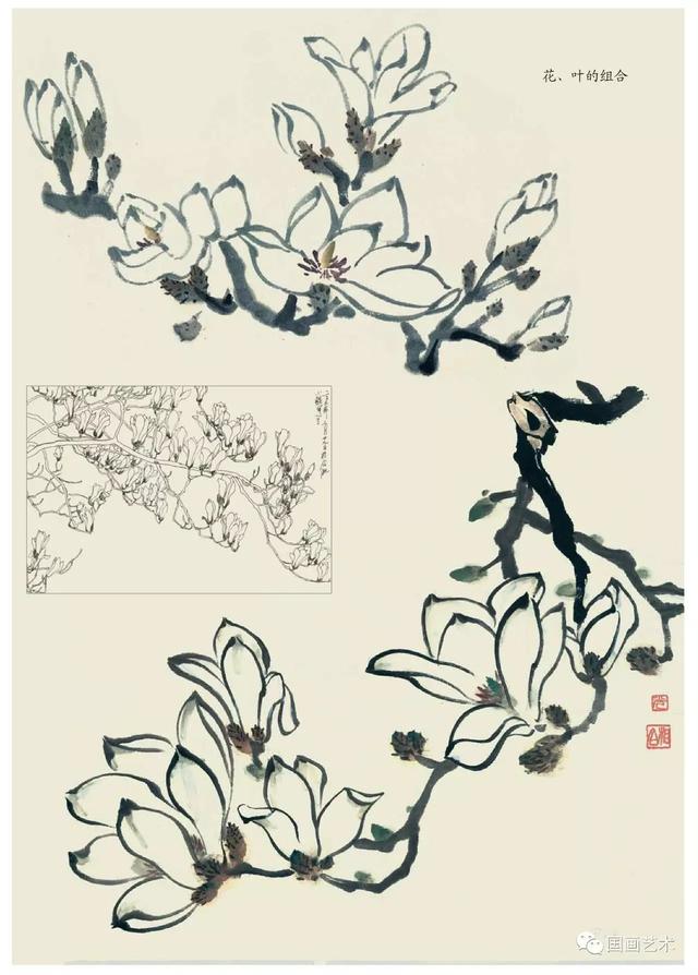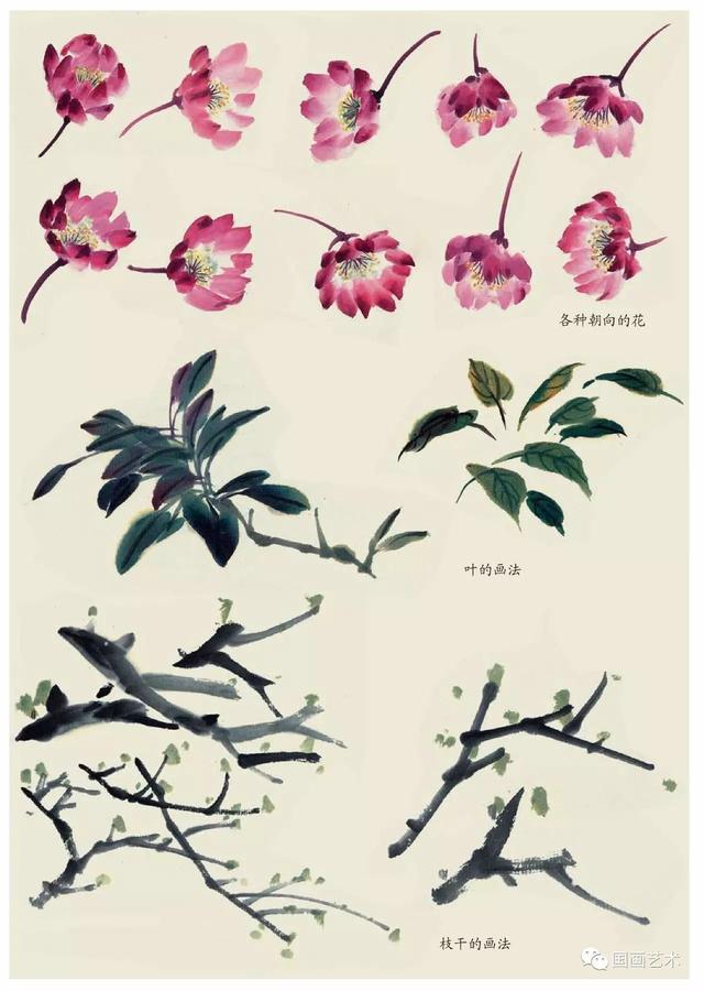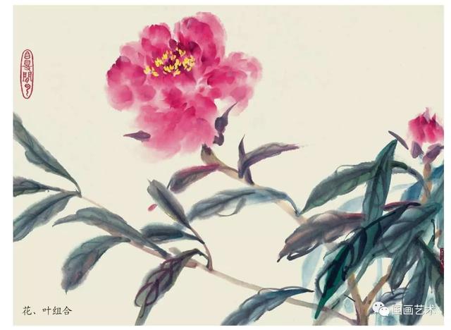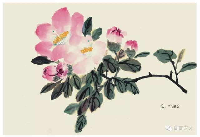 花、梗、叶组合:要注意冷暖色与浓淡的衬托,叶要有向背、转折以丰富画面,增加情趣和意境。