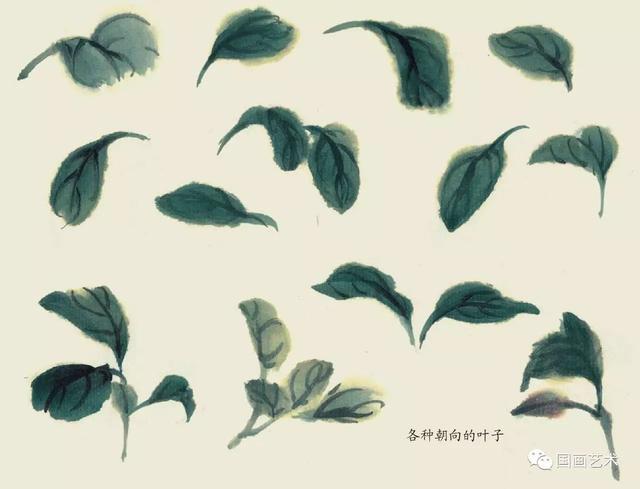 叶的画法:笔调汁绿蘸花青(或墨)写出,也可用浓、淡墨色勾写。
