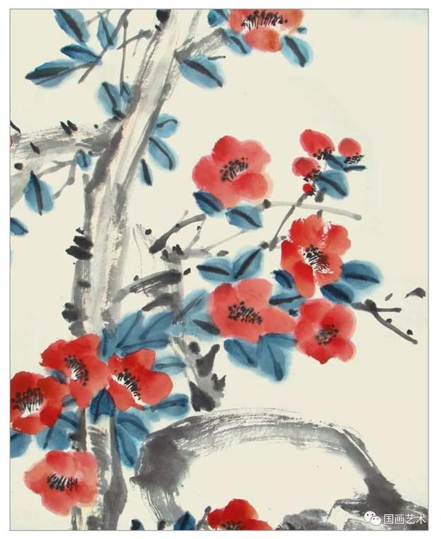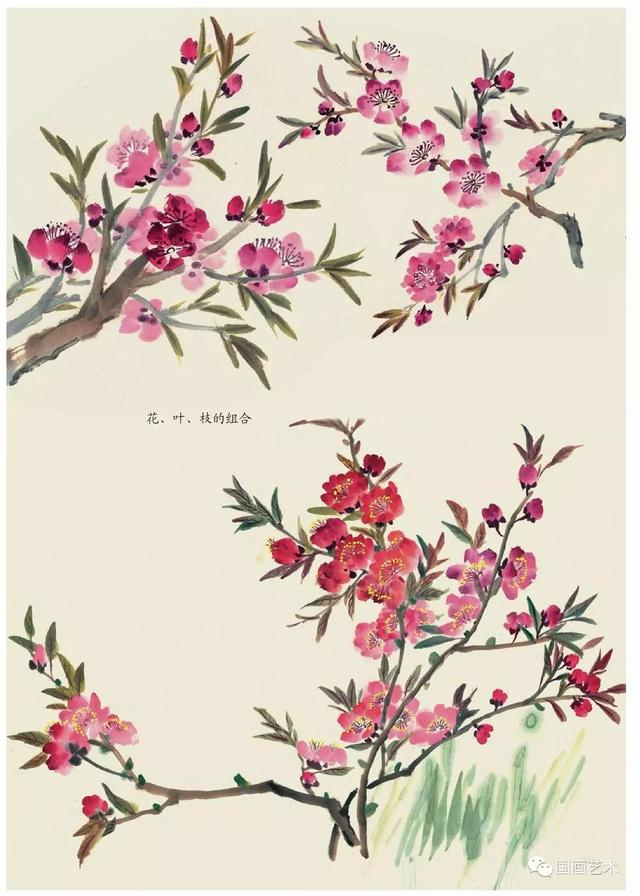花、叶、枝组合:干、枝用汁绿蘸曙红,中锋行笔写成。叶要有浓淡、大小、透视转折变化以增生动。