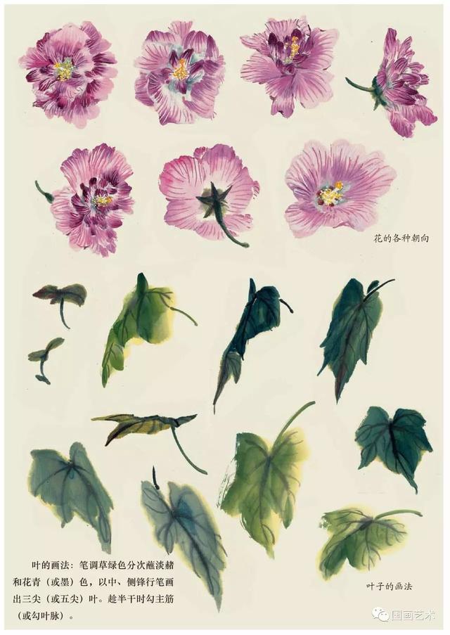 叶的画法:笔调藤黄加花青色成汁绿,笔尖再蘸花青(或墨)顿挫行笔成掌状。嫩叶色淡,笔尖可蘸少许曙红。