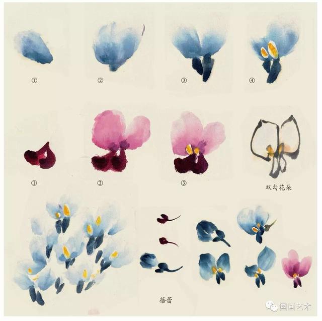 花的画法:笔调花青加白色(紫色花用曙红加酞青蓝加白色),笔尖蘸浓花青(或深紫色)点厾花朵上面的两大片花瓣,再蘸浓色点下面两片小花瓣。白粉加黄色点两点花蕊。