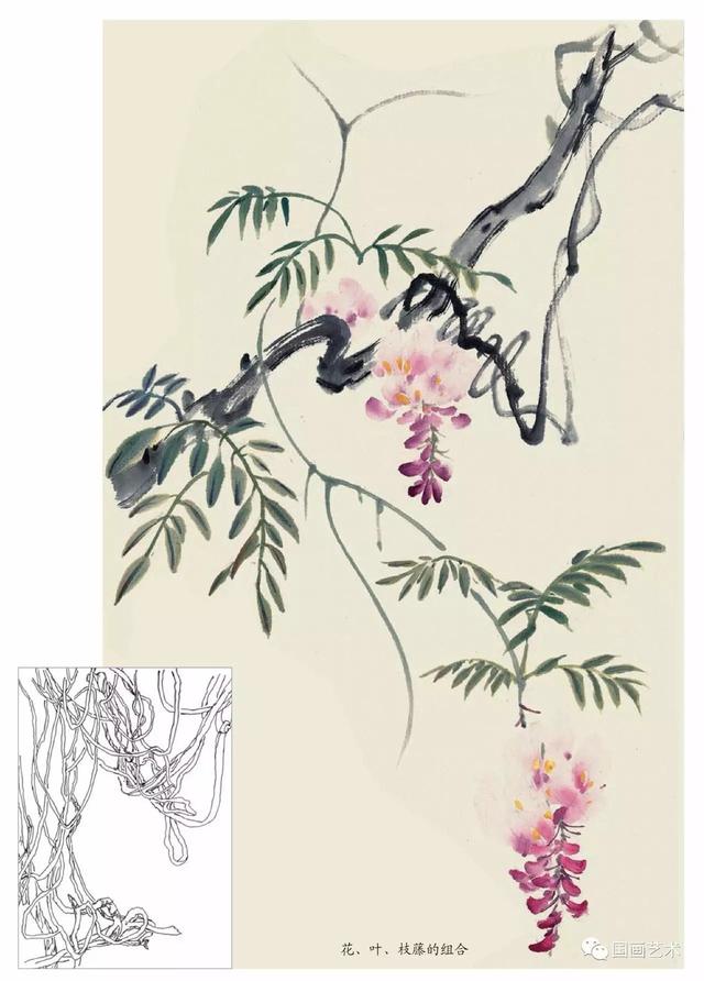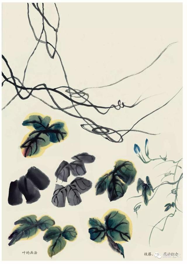 藤的画法:嫩藤用汁绿(或淡墨)以中锋勾写。中老藤用墨(或墨加赭石)以中、侧锋灵动用笔画成。要强调藤条的柔韧与转折。