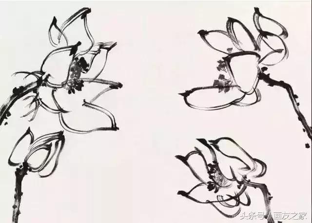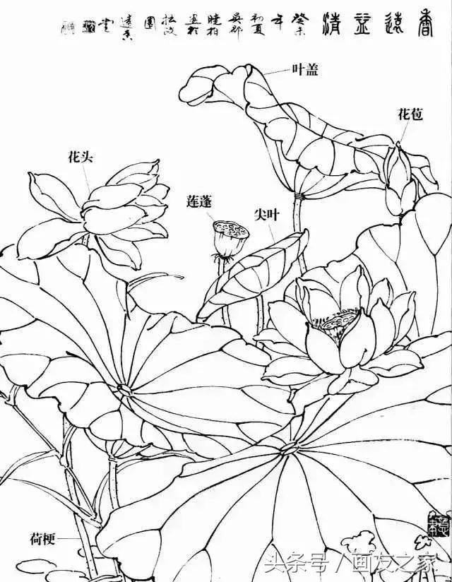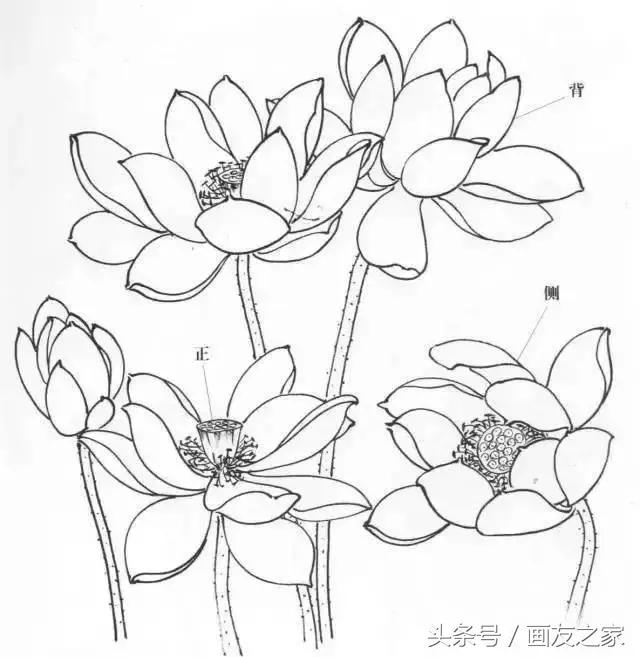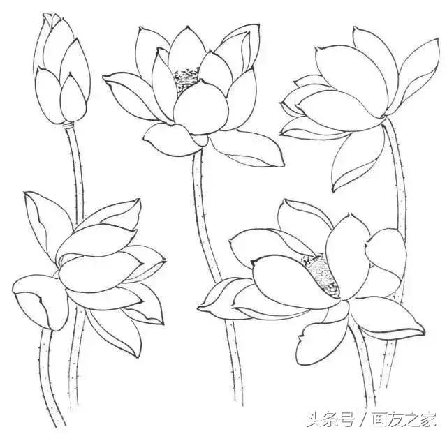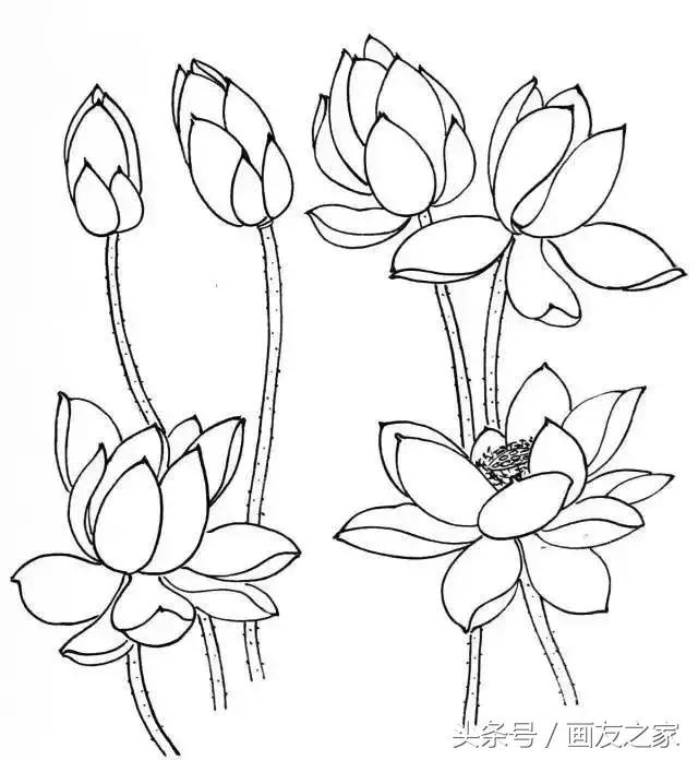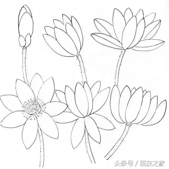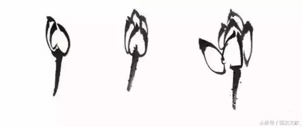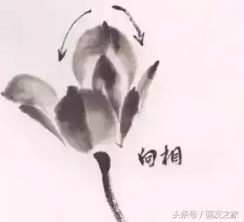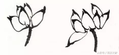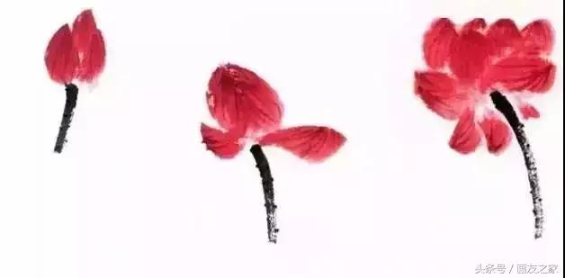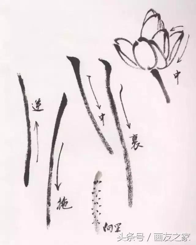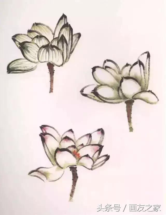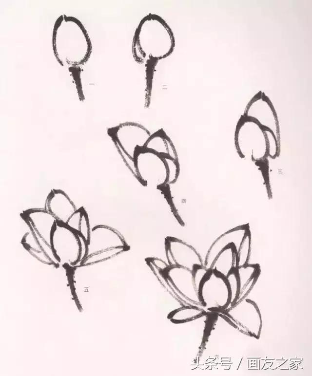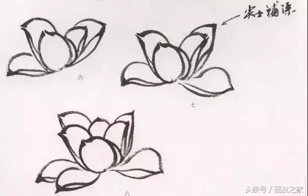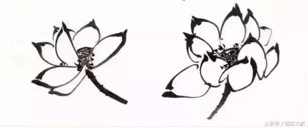双勾荷花开放的形状,中锋运笔,水分不宜多,行笔中要有顿挫并注意快慢。