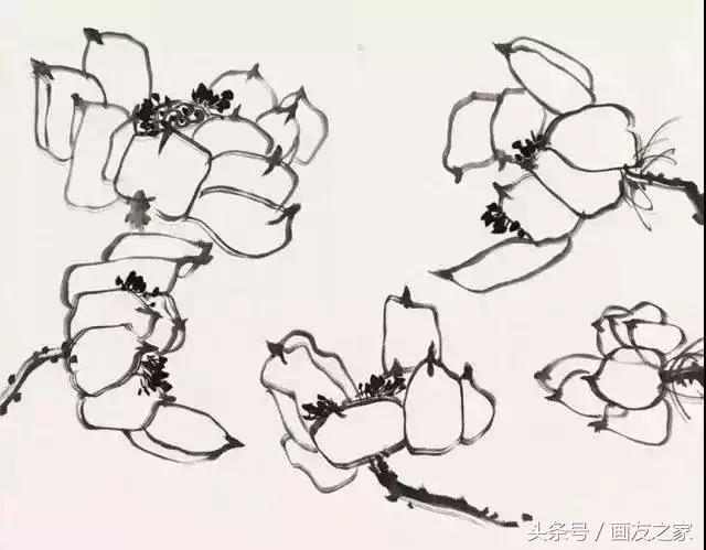双勾花头,初学者适宜用狼毫笔并以中锋勾勒。双勾训练是以线条变化来理解和表现对象的结构、质感,所以运笔时要有起笔和收笔的意识。线条既要遒劲稳重又要自然流畅。勾勒前要观察清楚花头初放、正放、凋谢各个时期的形态。