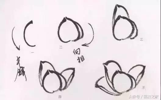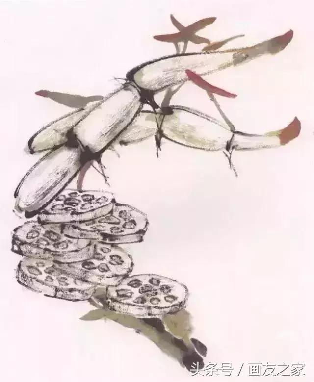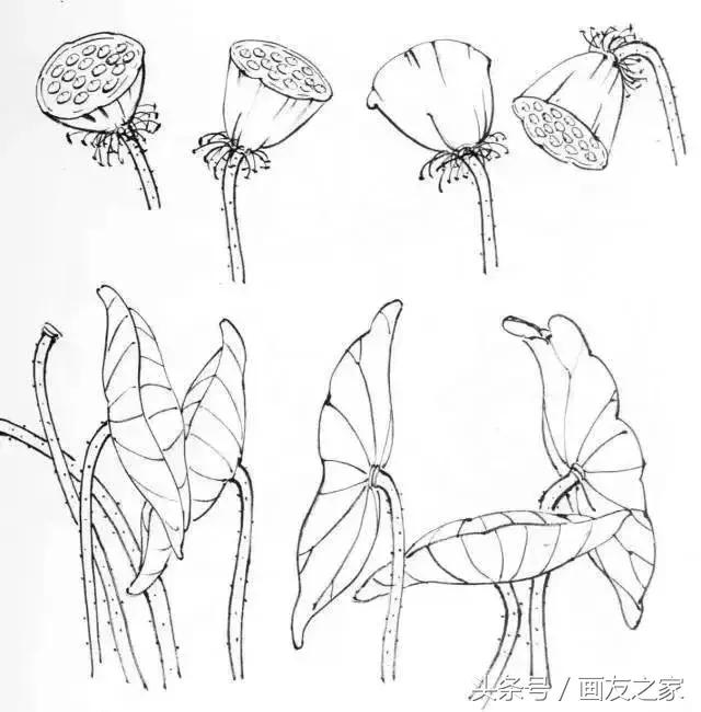如果要画叶盖的前半片和后半片,可以先画出前半片再画后半片,用墨为前深后淡法,也可用相反的方法。画叶盖的用笔内虚外实,画叶子的边缘处时为落笔处要实,叶子中心略虚,甚至可以留白,以突出叶脐和筋脉。