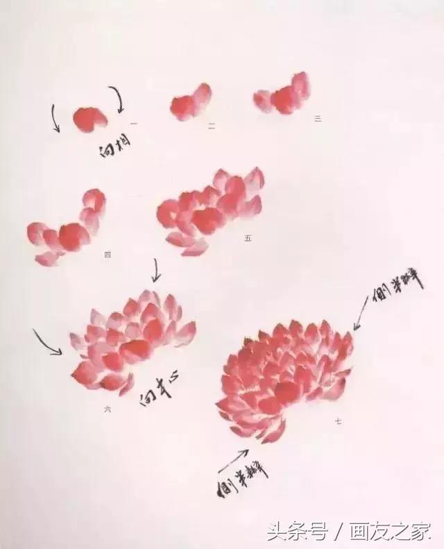 厾笔荷花要侧锋运笔,注意顿挫提按,笔尖、笔肚、笔根都要用好,要向相,事朵花画完后可以在花瓣尖上添以深色。