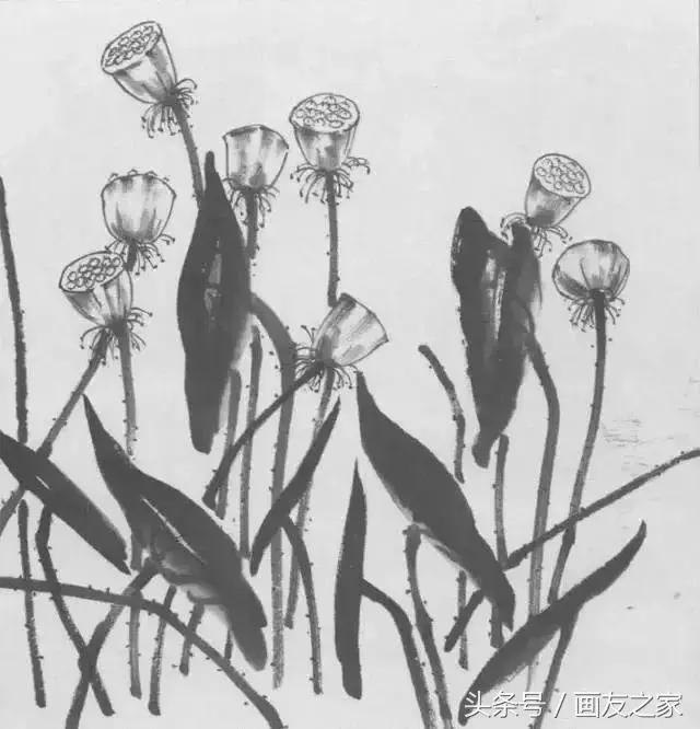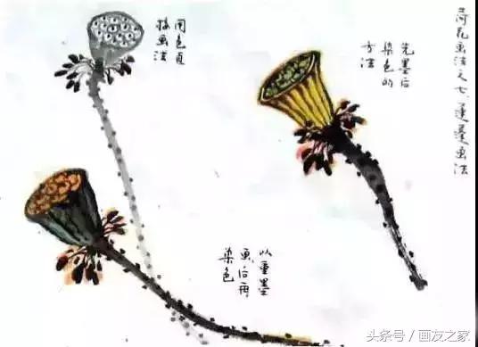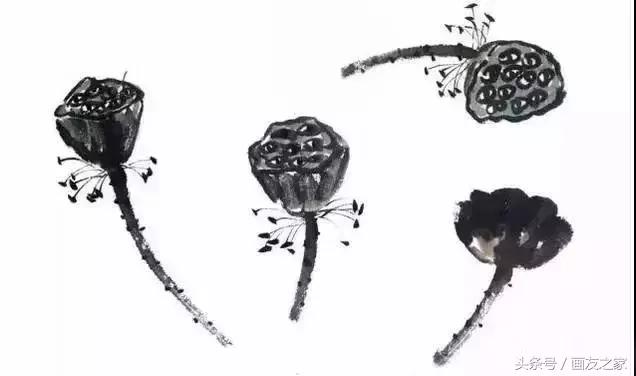 用墨色画花梗和叶梗时,要做到花重、叶重,梗也随之而重;花淡、叶淡,梗也随之而淡。梗的变叉应避免出现垂直线和平行线,相交角度也不要过大,要有长短、粗细、浓淡、枯湿的变化。 画柄时要注意用锋速度,通常以使用中、裹、逆、拖锋为宜,力求圆润挺拔。荷柄上的点要连贯,须疏密错落。
