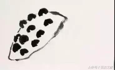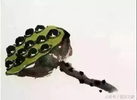 水墨画莲蓬时先勾勒出形状。从透视角度看,莲蓬有正、侧、背及倒挂的姿态,形状如代表团的圆锥体,它与荷梗相连成轴心,即荷梗顶端的方向就是莲蓬轴心的方向。又由于透视的缘故,我们与莲蓬之间有距离,不可能垂直看全莲蓬为一个正圆,所以画莲蓬时就不能画得太圆。