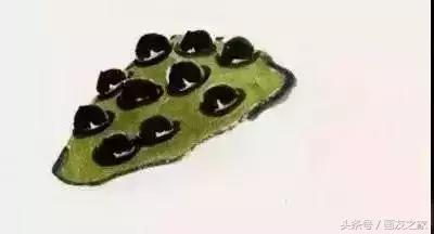 步骤一:先用藤黄调花青并加少许墨,调成较深的绿色点出莲子,勾出圆形外轮廓。