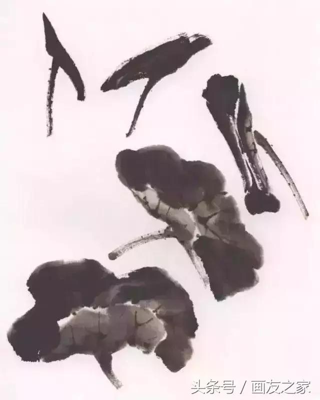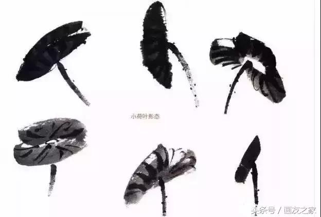 荷叶的几个形态,画时要注意运笔的快慢,可侧、中锋并用,须墨分五色。勾叶筋时不能让叶筋跳出叶子,要溶在叶里,须做到枯湿相间,有力有势。