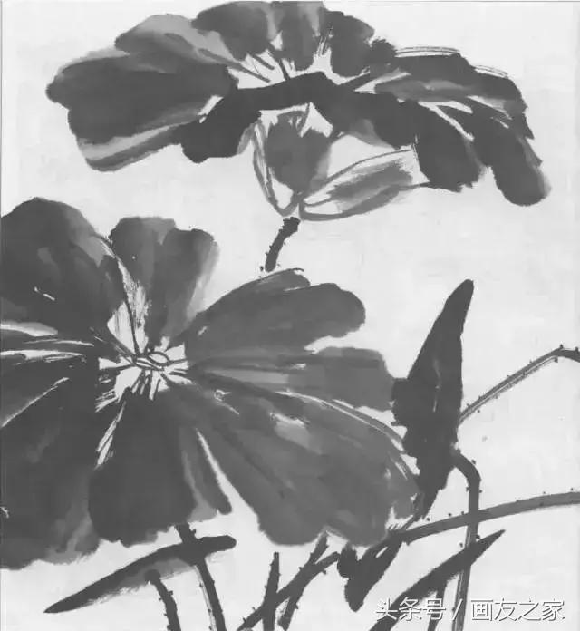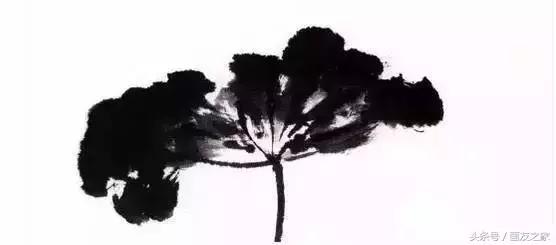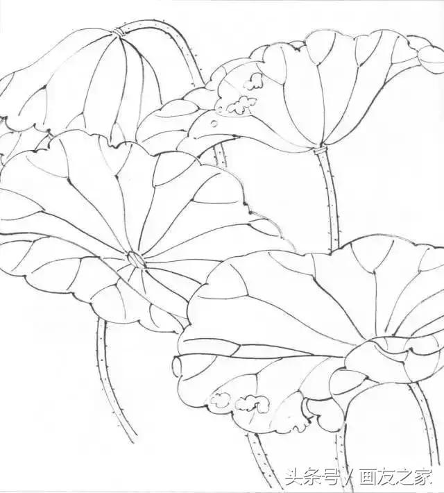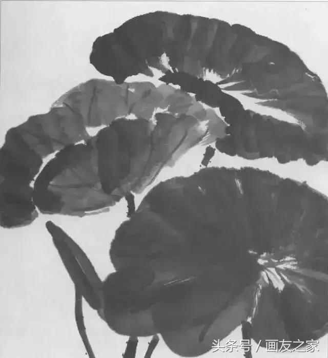 画翻叶、倒垂的叶,要掌握从荷梗的顶端去抓叶的走向。如果把荷盖与荷梗的关系理解成一把伞的伞柄与伞蓬的关系,那么伞的骨撑就如同荷盖背面的筋脉,它是沿着荷梗的方向,围绕着荷梗这个轴呈放射性撑开的圆盖状。这样一下子就解决了荷盖的动感和透视问题,画起来也就容易多了。一般画叶盖的背面用淡墨,正面用浓墨,浓淡有别分出正背。画时注意铺叶盖时留出空白的脐眼,不能让叶盖的铺墨与脐眼之间混成一团。避免叶盖与脐眼之间无凸凹感,成扁平状。