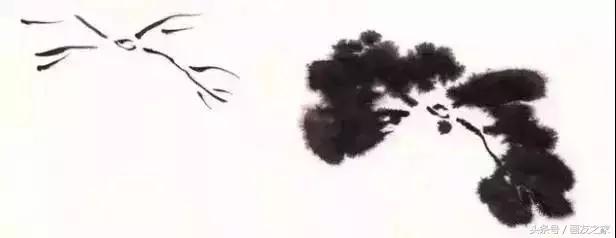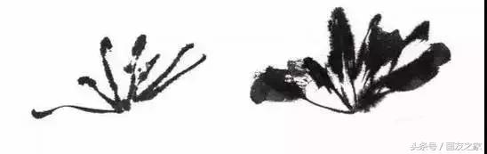 尖叶可以直接用浓墨一笔画出,也可以用两笔写成。如果淡墨画尖叶,墨铺上去待将干时再勾上叶筋表现出其卷筒形。这样画面有变化,看上去有笔有墨有形态。