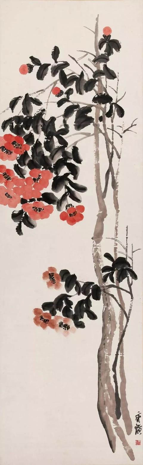 近现代 齐白石(1864-1957) 茶花 立轴 设色纸本 182cmx56cm