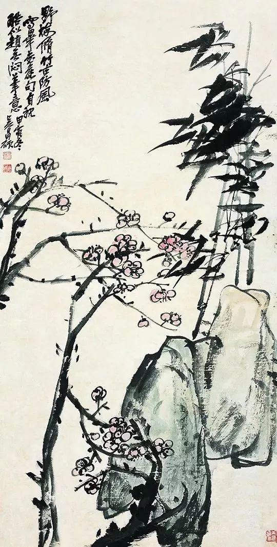 近现代 吴昌硕( 1844-1927) 野梅修竹图 设色纸本 135cmx67cm