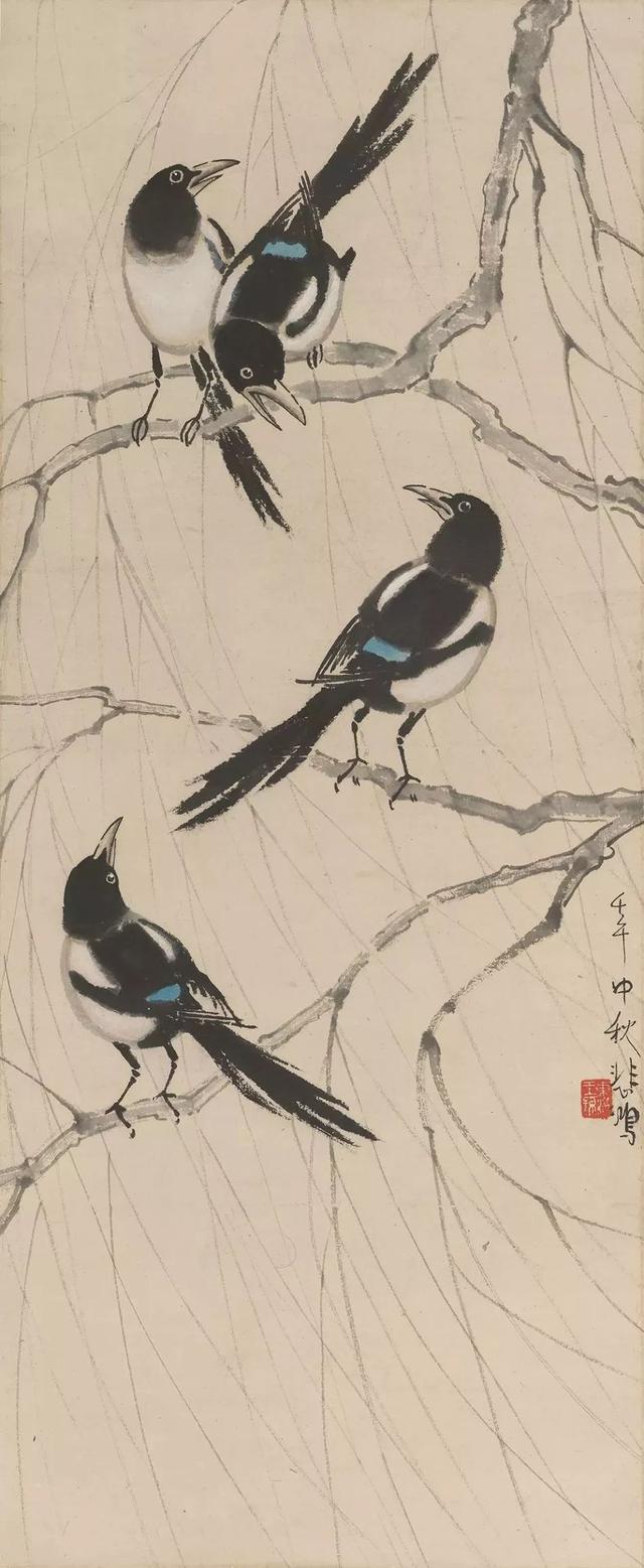 近现代 徐悲鸿(1895-1953) 四鹊图 立轴 设色纸本 88cmx36cm