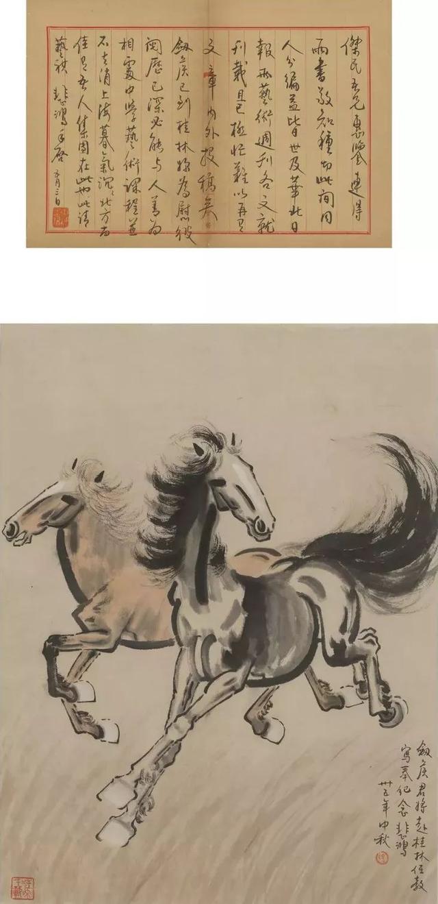 近现代 徐悲鸿(1895-1953) 信扎 26cmx38cm & 双马图 立轴 设色纸本