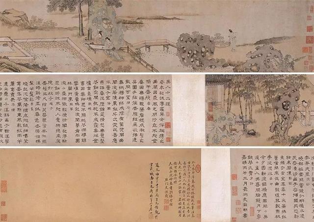 元 明 张渥(约1356前) 文徵明(1470-1559) 十二美人倦绣图 手卷 设色纸本 24cmx140cm
